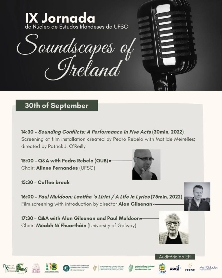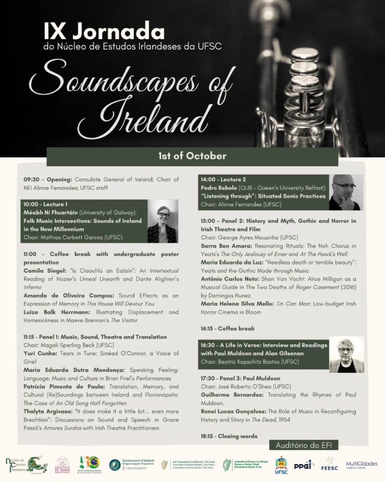 Jornadas do Núcleo de Estudos Irlandeses da UFSC IX Jornada do Núcleo de Estudos Irlandeses da UFSC (30-01•09-10•25) Soundscapes of Ireland VIII Jornada do Núcleo de Estudos Irlandeses da UFSC (5-6•11•24) Link para inscrições: https://inscricoes.ufsc.br/viiijornadadonei VII Jornada do Núcleo de Estudos Irlandeses da UFSC (7-8•11•23) Irish Arts and Disabilities Acesse a programação completa do evento aqui V Jornada do Núcleo de Estudos Irlandeses da UFSC (12•11•21) Intersections of Irish literature, theatre and technology IV Jornada do Núcleo de Estudos Irlandeses da UFSC (05•11•19) Where Irish literature, theatre and history meets III Jornada do Núcleo de Estudos Irlandeses da UFSC (07•11•18) (Con)figurations of families in Irish literature, theatre and film II Jornada do Núcleo de Estudos Irlandeses da UFSC (07•11•17) Protean spaces in Irish literature, theatre and film I Jornada do Núcleo de Estudos Irlandeses da UFSC (17•08•16) Myth and reality in Irish literature, theatre and visual arts